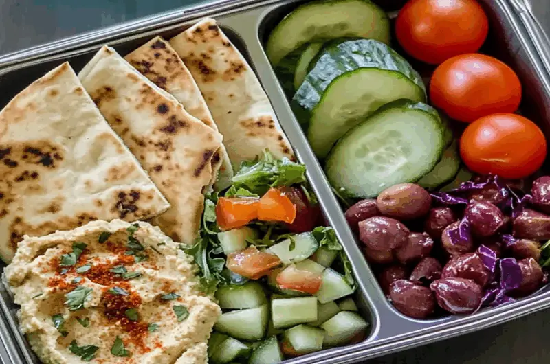 Cucumber Salad, Hummus & Pita Bento Box Lunch is a refreshing and vibrant meal that combines crunchy cucumbers, sweet cherry tomatoes, zesty red onion, creamy hummus, and fluffy pita bread. Perfect for busy days or picnics, this bento box not only delights the palate but also pleases the eyes with its colorful presentation. Easy to prepare and customize according to your taste, this dish is an ideal choice for a nutritious and satisfying lunch.