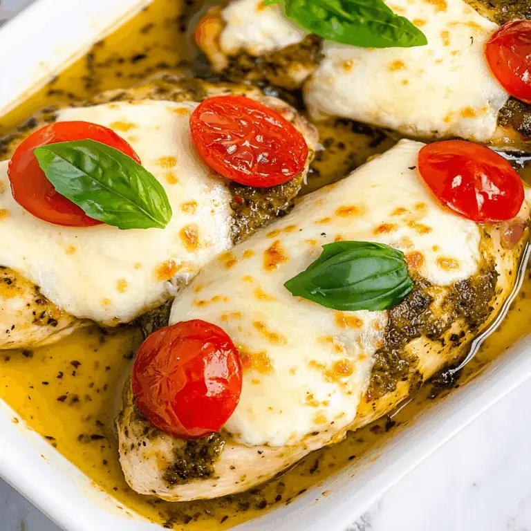 Baked Pesto Mozzarella Chicken is a mouthwatering dish that effortlessly combines juicy chicken breasts with rich basil pesto and melty mozzarella, topped with sweet cherry tomatoes. This easy-to-make recipe brings Italian flavors right to your table, making it ideal for busy weeknights or special gatherings. With minimal prep time and maximum flavor impact, it’s sure to impress your family and friends.