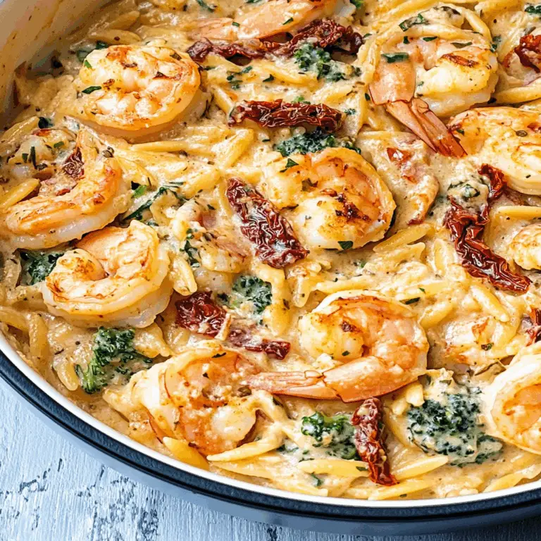 Prawn Orzo with Sun-Dried Tomatoes is a vibrant Mediterranean dish that brings a burst of flavor to your table. This quick and easy recipe combines succulent prawns, tender orzo pasta, and tangy sun-dried tomatoes, all enhanced with fresh herbs and a splash of lemon juice. Perfect for weeknight dinners or elegant gatherings, this colorful meal is not only delicious but also visually appealing, making it a favorite among family and friends.