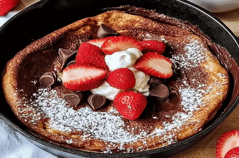 A Chocolate Dutch Baby Pancake is a unique, puffy pancake that bakes in the oven. It combines eggs, flour, milk, and cocoa powder for a rich chocolate flavor. This delightful dish puffs up while baking and creates crispy edges with a soft center. It’s often served with powdered sugar or fresh fruit on top, making it an impressive breakfast or brunch option.