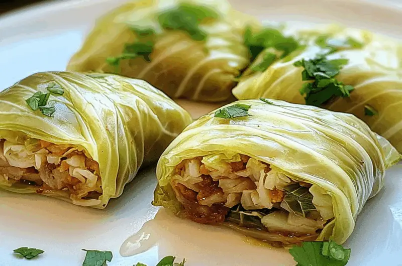 - Assemble the Dumplings: Spoon filling onto each cabbage leaf, fold sides in, and roll tightly.