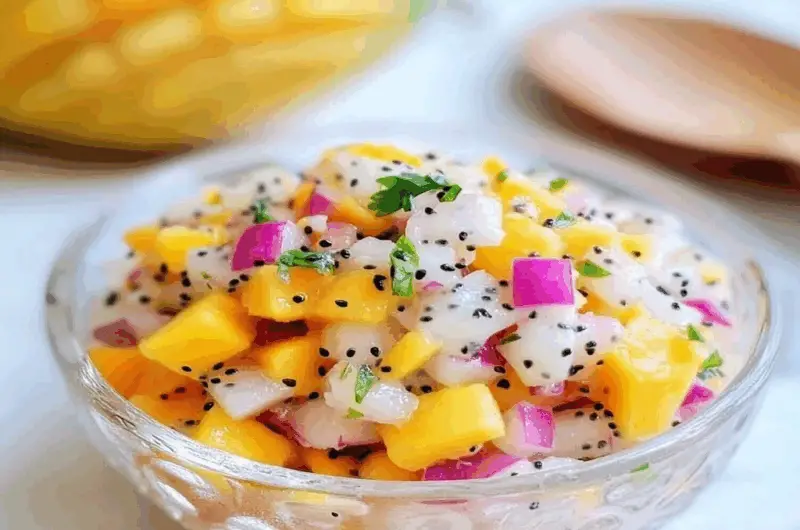 In summary, Dragon Fruit Mango Salsa is a colorful and flavorful dish that adds a tropical twist to your meals. With its unique blend of dragon fruit and mango paired with zesty lime juice and fresh herbs, this salsa brightens up any occasion. a fruity smoothie to enjoy Whether you serve it with grilled meats or enjoy it with chips, it’s sure to impress your guests. peach mango pies for dessert Try making this salsa today to experience its delightful taste!