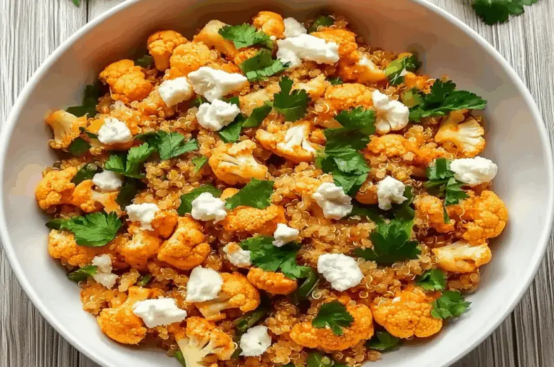 Experience the zesty fusion of flavors with this Buffalo Cauliflower Quinoa Salad. Crispy roasted cauliflower tossed in spicy buffalo sauce meets fluffy quinoa, creating a colorful and satisfying dish perfect for any occasion. Whether you’re enjoying it at a picnic or a cozy night in, this salad is sure to impress with its vibrant taste and nutritious ingredients.